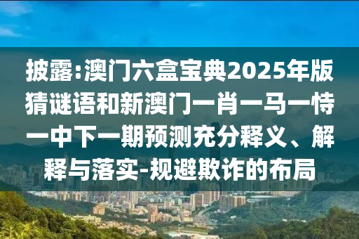 近年來,隨著游戲市場的繁榮,各種游戲預測和寶典也層出不窮,我們需要明確一點,任何游戲預測都僅僅是基于概率的推測,沒有任何一種方法可以確保準確,公眾在面對此類信息時,應保持理性態(tài)度,警惕虛假宣傳,本文將針對關鍵詞“披露”、“澳門六盒寶典2025年版猜謎語”、“新澳門一肖一馬一恃一中下一期預測”進行充分釋義、解釋與落實,并探討如何規(guī)避欺詐布局。